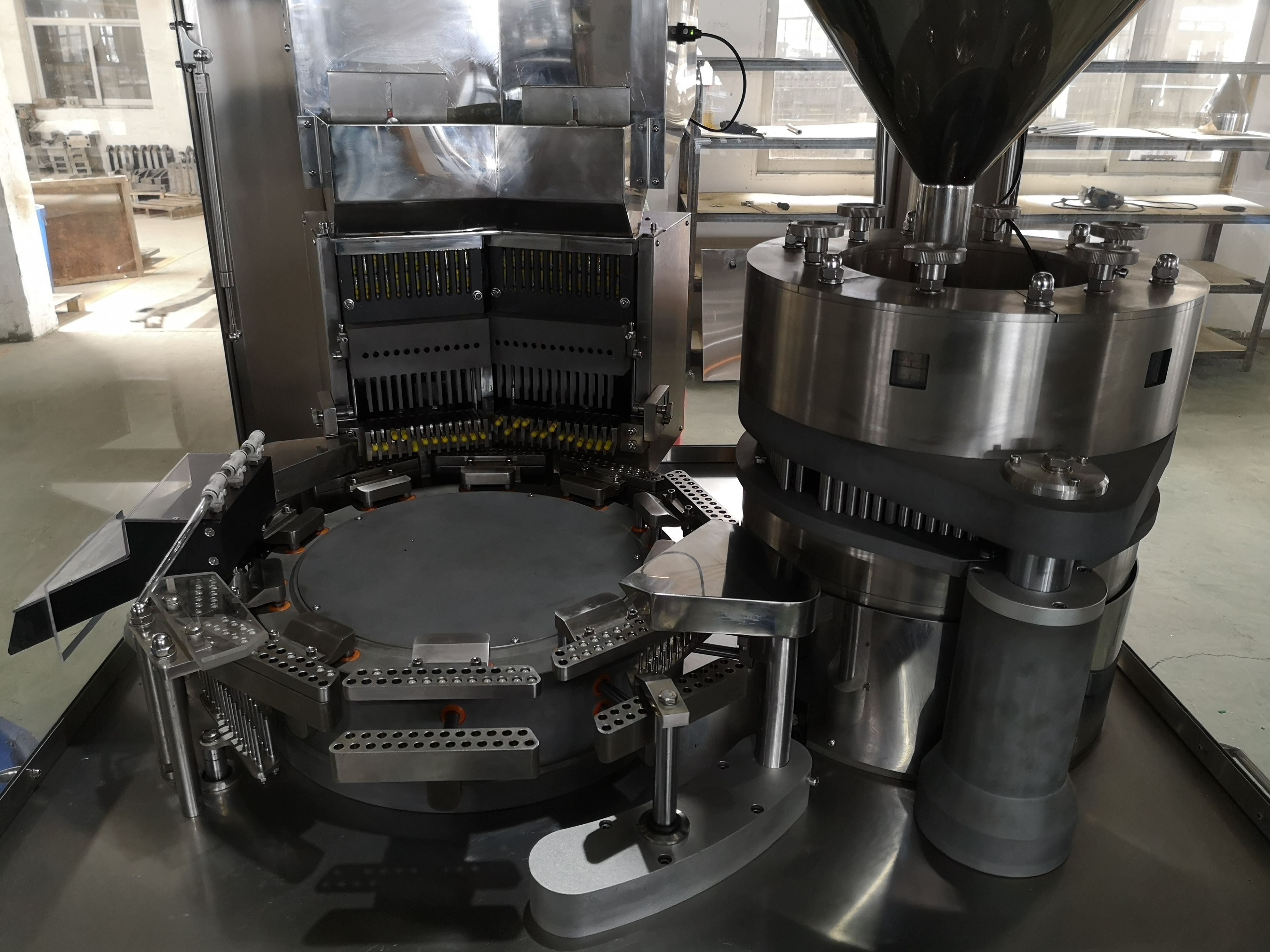 全自动胶囊充填机由空胶囊下料装置、胶囊分送装置、粉剂下料装置、计量盘机构、胶囊充填封合机构、箱内主传动机构和电器控制系统等组成。