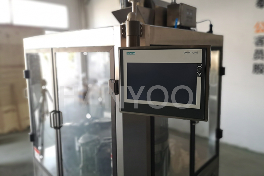在工作过程中,将从胶囊桶中随机掉落的空胶囊经过分类和定位排列,使胶囊帽在上的状态,依次落入主工作盘囊板的孔中。在拔囊区,拔囊装置采用真空抽吸使胶囊落入脚踏板孔中,而胶囊帽停留在上孔中。在体振幅移位区,将上盖板与胶囊帽一起移下,将上盖板置于定量灌装装置下。在灌装区,定量灌装装置将药物灌装到胶囊中。在剔废胶囊区,剔废装置应将未拨开的空胶囊从上囊板孔中踢除出去。在胶囊封闭区域内,将胶囊上、下板孔轴线对准,通过加压将胶囊盖与胶体封闭。在出料区,封闭的胶囊通过出料板孔通过出料装置排出,通过出囊滑道进入包装程序。在清洗区域,清洗装置去除上下囊孔内的药物、胶囊头皮屑等污染物。然后它进入下一个运行周期。由于每个区域都需要一定的时间来操作,所以主工作盘会间歇性地旋转。