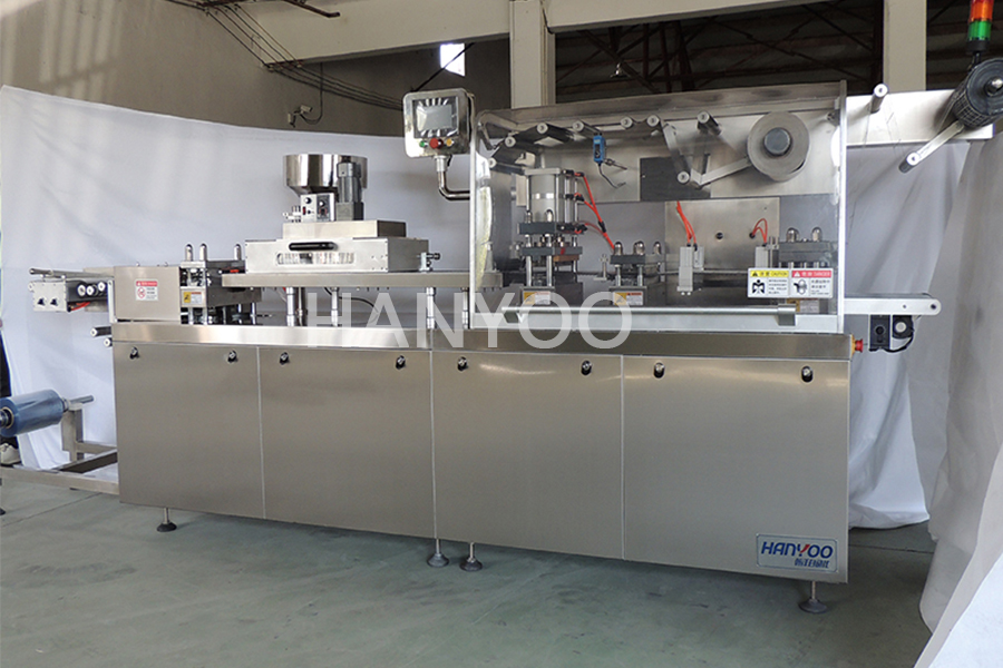 总结流程∶PVC片匀速放卷 →PVC 片加热软化 → 真空吹泡 → 药片入泡壳 → 线接触式与铝箔热封合 → 打字印号 → 冲裁成块